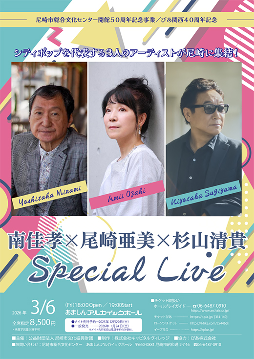 シティポップを代表する3人のアーティストが尼崎に集結! 3人による、その日限りのコラボレーションが見られるかも!? 長きにわたり音楽シーンをリードし続ける彼らの歌声と、色あせることのない名曲の数々をご堪能ください。