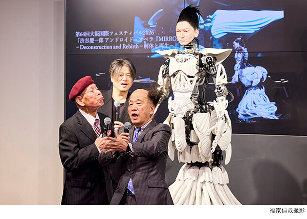 アンドロイドが歌手を担当する異色のオペラ公演『渋谷慶一郎 アンドロイド・オペラ「MIRROR」-Deconstruction and Rebirth-解体と再生-(第64回大阪国際フェスティバル2026)』が5月16日(土)に大阪・フェスティバルホールで開催。その記者会見が1月13日に大阪市内で開かれ、コンセプトと作曲の渋谷慶一郎、歌手を務める「世界一美しいアンドロイド」のアンドロイド・マリア、そして特別ゲストとして漫才コンビの海原はるか・かなたが出席した。
