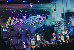 昼12:00に開場された場外エリアでは、グッズやCD、ドリンクはもとより、その匂いに誘われて長蛇の列ができたFM802DJ樋口大喜とコラボしたハンバーガー、でらし(b)考案のGALAXY PARKソフトクリームも販売。加えて、看板や垂れ幕、オブジェ等が設置された計5カ所のフォトスポットに、ガチャガチャ、ハンブレッダーズのFC限定の『スーパーぶれまるすくい』にはメンバー自ら訪れるなど(ちなみにムツムロ アキラ(vo&g)はそこで自身の両親とバッタリ遭遇しつつ(笑)、見事スーパーぶれまるボールをゲットしていた)、どこもかしこも縁日ばりの大にぎわいだ。