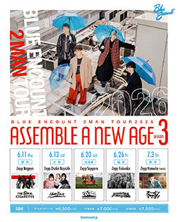 ブルー・エンカウント=田邊駿一(Vo/Gt)、江口雄也(Gt)、辻村勇太(Ba)、高村佳秀(Dr)によって熊本で結成されたエモーショナル・ギターロックバンド。デビュー以降メッセージ性の高い歌詞と熱いバンドサウンドが話題となり、ドラマやアニメ、映画、CMなど数々のタイアップ楽曲を担当。アニメ『銀魂』『僕のヒーローアカデミア』『BANANA FISH』などのアニメ主題歌に加え、ドラマ主題歌なども数多く手がける。中でも『僕のヒーローアカデミア』のオープニングテーマ「ポラリス」は全世界総再生数1億回突破、日本テレビ系土曜ドラマ『ボイス110緊急指令室』の主題歌『バッドパラドックス』はストリーミング総再生数6000万回を記録した。2021年4月には横浜アリーナにて初のワンマンライブを2デイズで、2023年2月には約6年半ぶりとなる武道館でのワンマンライブを開催。2025年2月には約5年ぶり5枚目となるフルアルバム『Alliance of Quintetto』をリリースし25本のツアーを完走した。2023年3月からアメリカと日本の2拠点で活動していた辻村が昨年9月に帰国し、再び4人体制での活動を再開したことでも話題となっている。