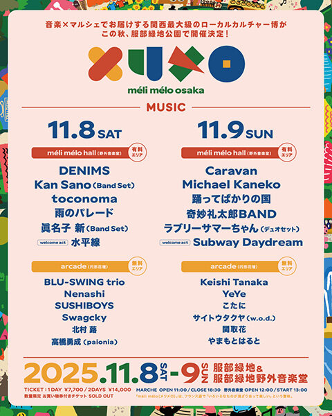 音楽×マルシェでお届けする関西ローカルのカルチャー博『méli mélo osaka(メリメロオーサカ)』が、11月8日(土)・9日(日)、服部緑地&服部緑地野外音楽堂にて開催される。