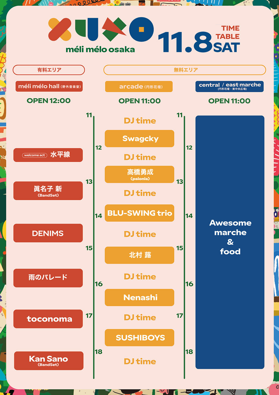 音楽×マルシェでお届けする関西ローカルのカルチャー博『méli mélo osaka(メリメロオーサカ)』が、11月8日(土)・9日(日)、服部緑地公園&服部緑地野外音楽堂にて開催される。今回、待望のタイムテーブルとMAPを公開された。