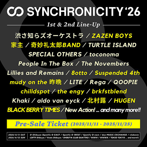 ホーム > NEWS > 「SYNCHRONICITY’26」第2弾ラインナップで、 ZAZEN BOYS、家主、奇妙礼太郎BAND、8ottoら 12組発表! 限定の先行チケット発売スタート!