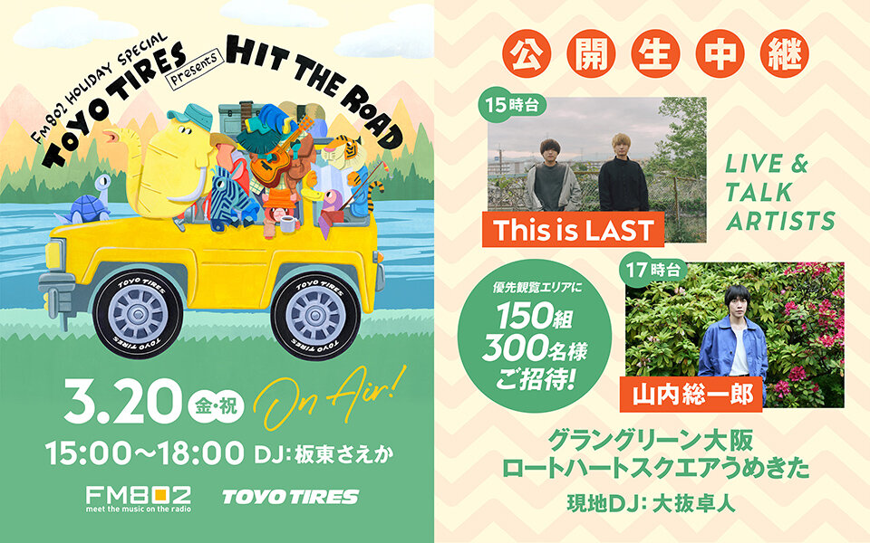 月20日(金・祝)お昼3時からは『FM802 HOLIDAY SPECIAL TOYO TIRES presents HIT THE ROAD』をオンエア。FM802とTOYO TIRESがタッグを組み、話題のグラングリーン大阪ロートハートスクエアうめきたで、FM802所縁のゲストを迎えてのライブ&トークイベントを実施。その模様をこの特別番組内にて公開生中継される。15時台にThis is LAST、17時台に山内総一郎が登場。アーティストと一緒に、春のドライブに行きたくなる1日をお届け。