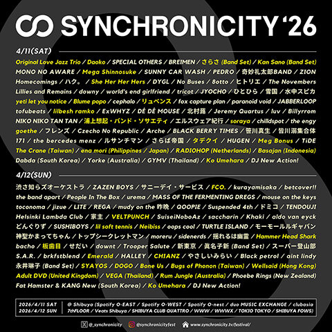 4月11日(土)、4月12日(日)に東京・渋谷にて開催の都市型フェスティバル「SYNCHRONICITY'26」の最終ラインナップが発表となった。