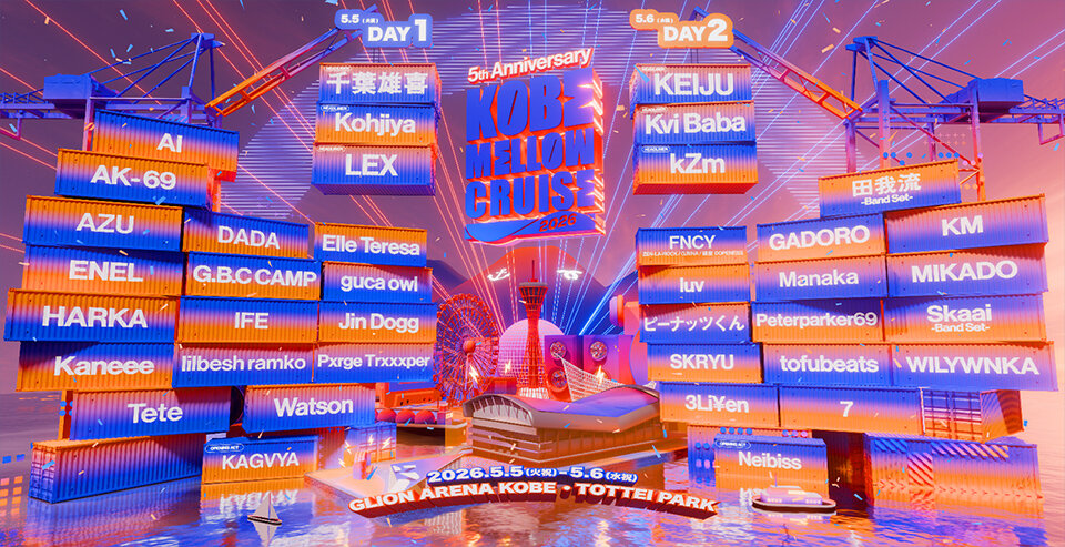 2022年より神戸で開催している都市型野外音楽フェス「KOBE MELLOW CRUISE」。開催5周年となる来年は、会場をGLION ARENA KOBEとその横に位置する海が臨める公園、TOTTEI PARKに移転し、5月5日(火・祝)、6日(水・祝)に開催される。