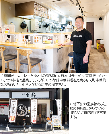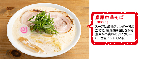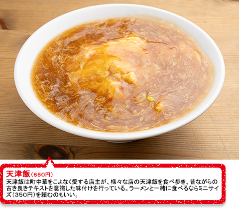 「飲める」をテーマにした店主渾身の天津飯は、鶏&豚スープに醤油をしっかりきかせた濃くて甘味のある餡が、フワリと火が通った卵に包まれたご飯によく合う。隠し味として加えたショウガの酸味がアクセントになって、ついガツガツ食べてしまう美味しさだ。鶏と豚を12時間強火で炊き上げた白湯スープがクセになる濃厚中華そばと一緒にぜひ。魚介をきかせた清湯醤油スープを使ったあっさり中華そばもおすすめだ。